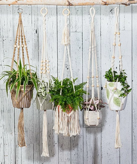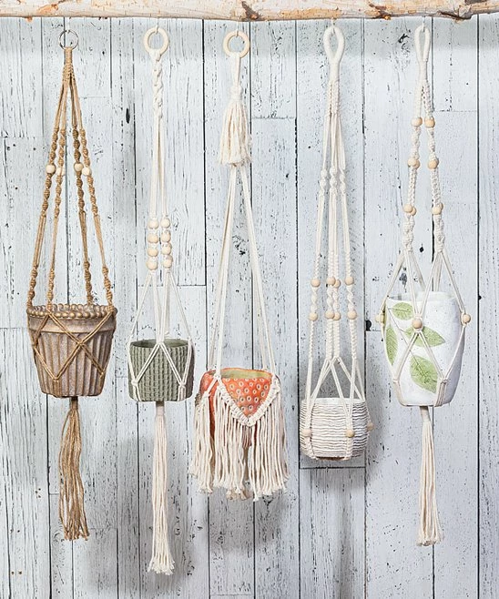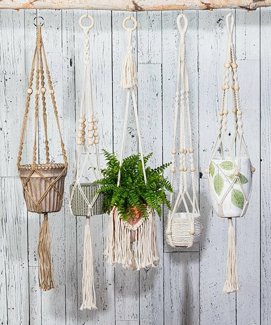 Add a touch of boho macramé flair to your favorite planter while saving on surface space with this durable cotton hanger that features beaded accents and a fringed tail.