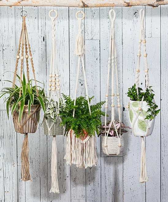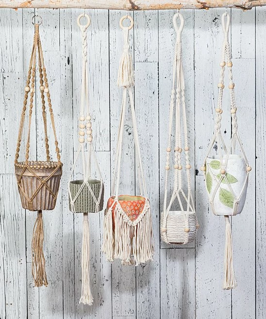 Add a touch of boho macramé flair to your favorite planter while saving on surface space with this durable cotton hanger that features beaded accents and a fringed tail.