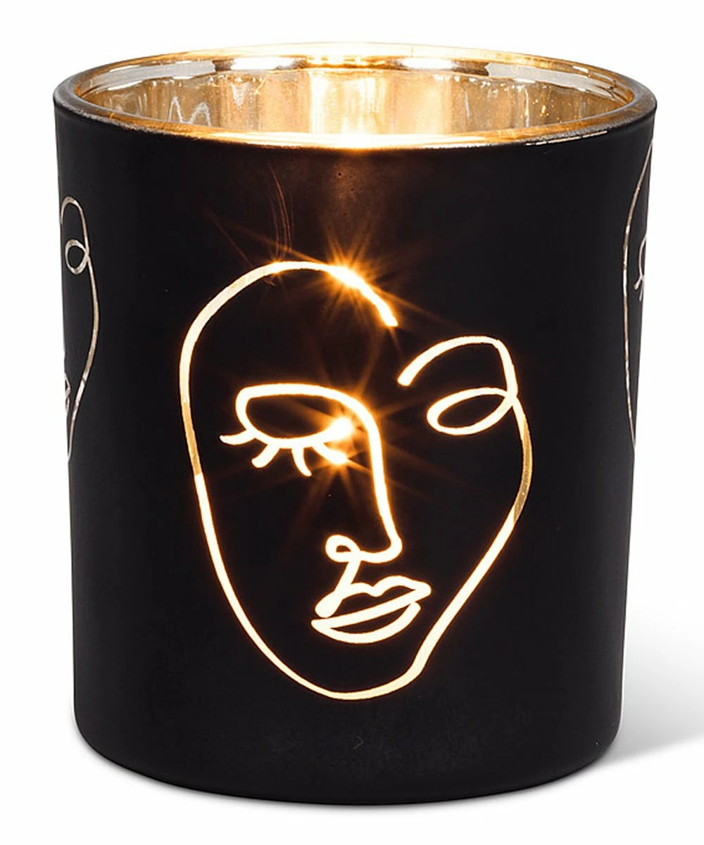 Metal and glass tealight candle holder features elegant abstract stencil of an expressionaist-style face.
