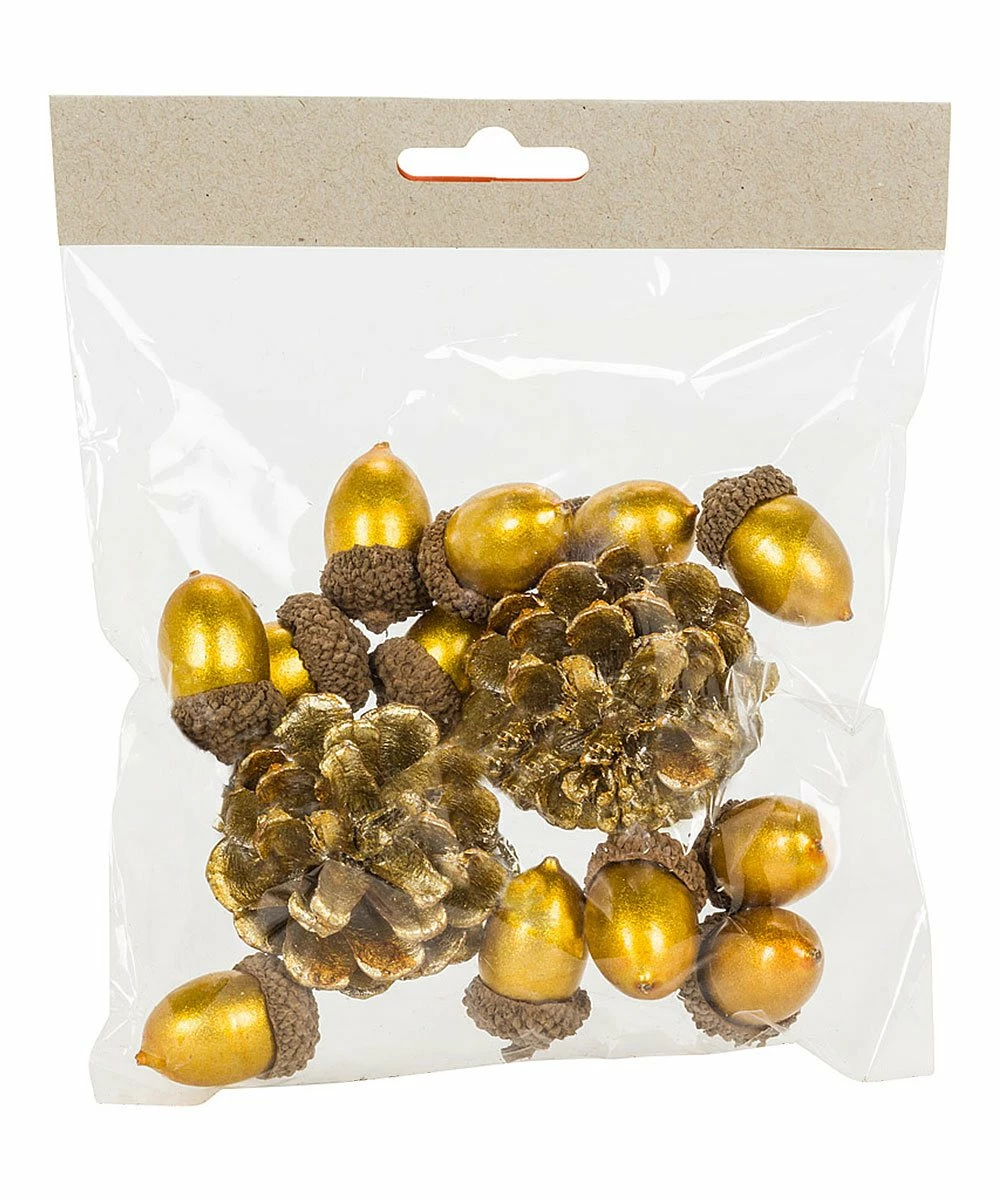 Elevate your festive décor with these acorns and pine cones boasting a shiny metallic-looking surface and trim ready for holiday-themed display in your space.