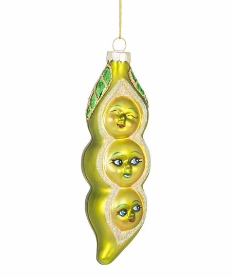 Refresh your holiday dΓ©cor with this glittering ornament featuring three smiling peas.
