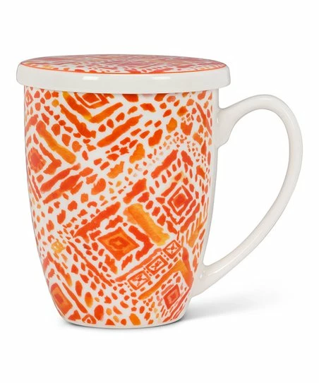 Sip your morning tea in this lidded mug that includes a strainer for loose leaves and features a geometric print.