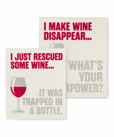 Entertain guests with this humorous dishcloth set crafted from superabsorbent cellulose, each one sporting a witty wine joke.