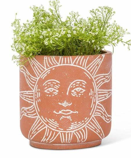 This terracotta-toned planter features a subtle etched-style line drawing of the sun in all its smiling glory.